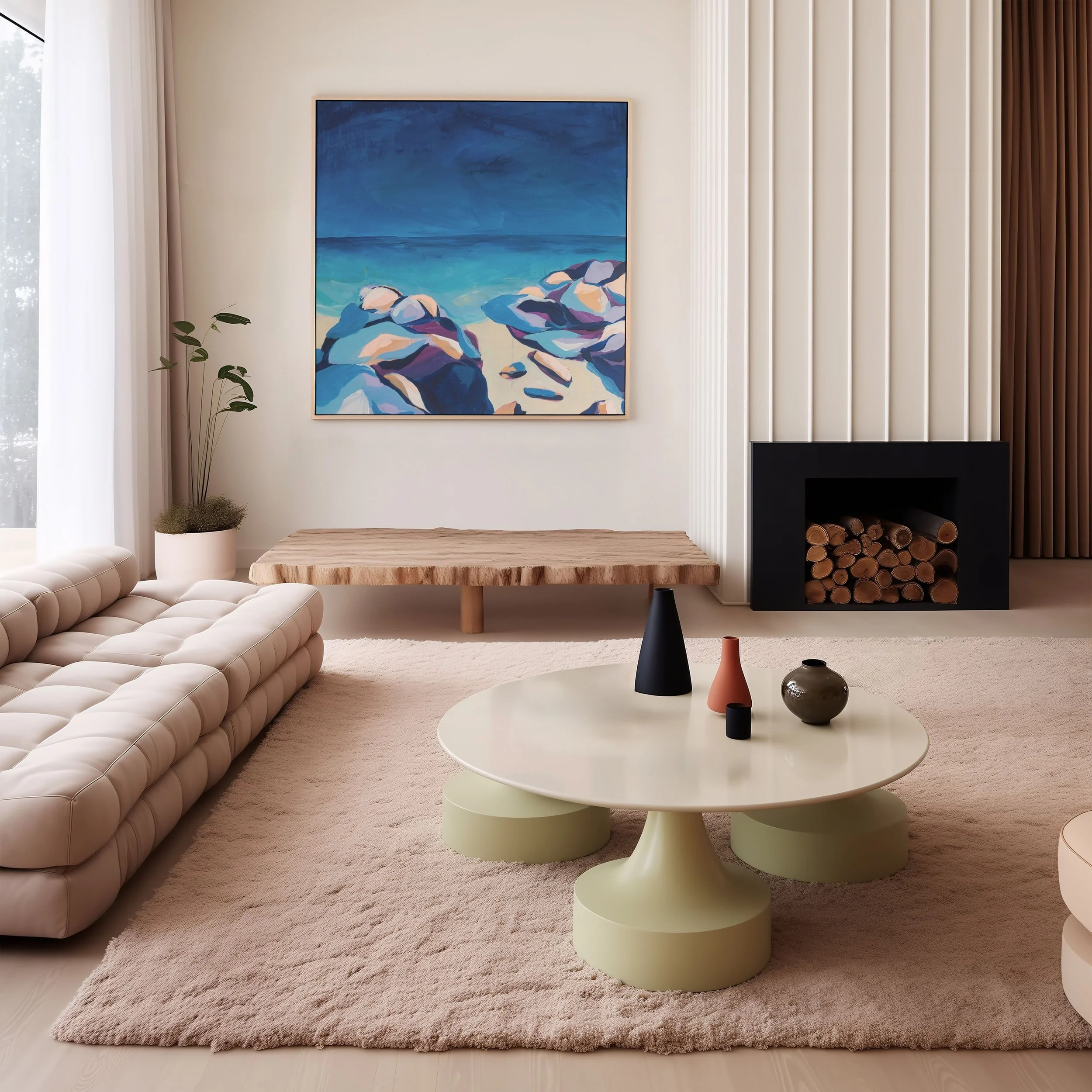 St Ives Harbour is an original painting that vividly captures the serene beauty of a seaside landscape. The foreground features large, beautifully textured rocks in an array of pastel hues—shades of pink, blue, purple, and white—adding a captivating depth to the composition. These vibrant rocks lead the eye towards a calm turquoise sea that stretches out to meet the deep blue sky on the horizon. Bring the soothing ambiance of the seaside into your home.
